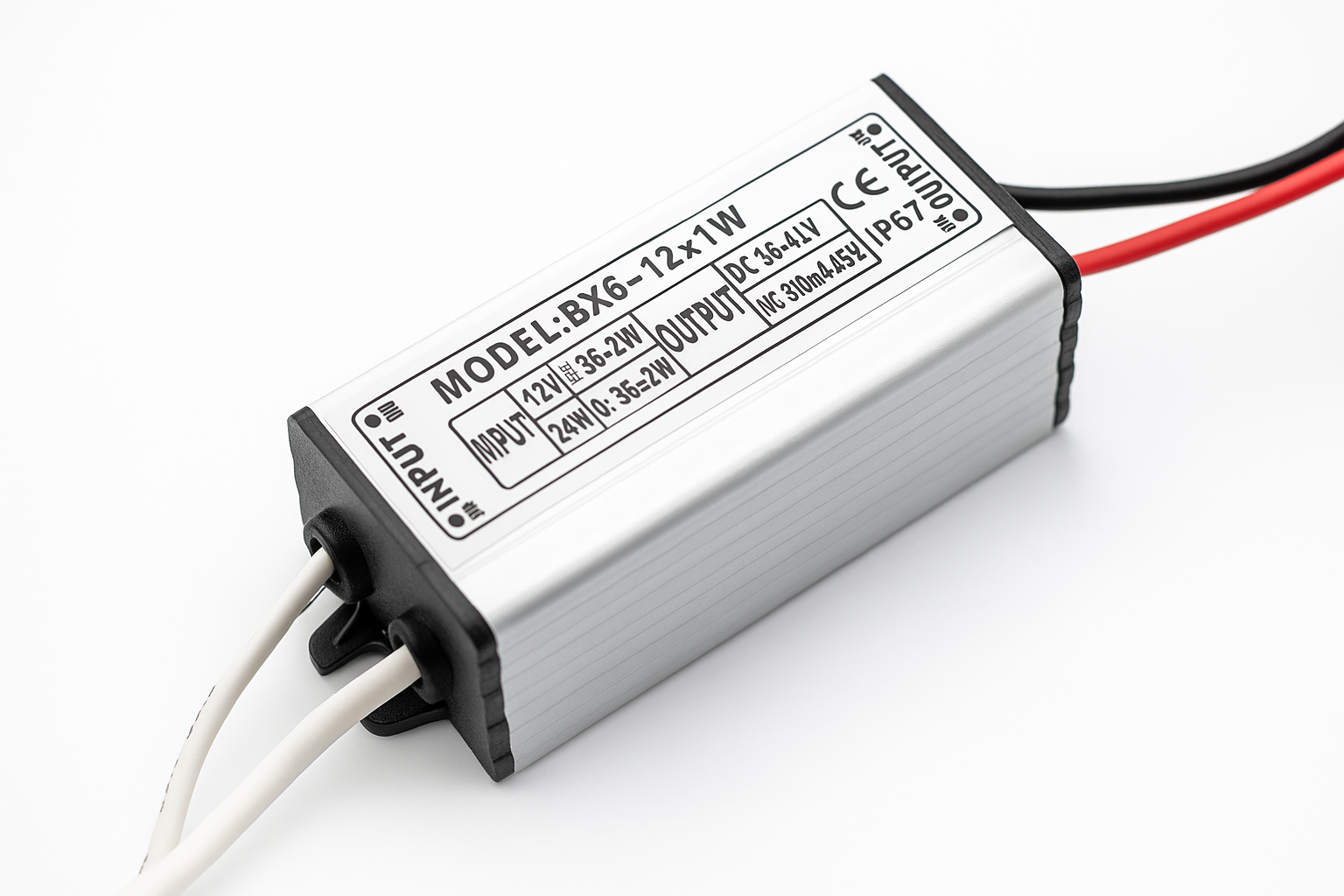 Driver LED de 12W, salida 24V DC (0.5A). Entrada universal AC 90-265V. Protección IP65 para exteriores o zonas húmedas.
